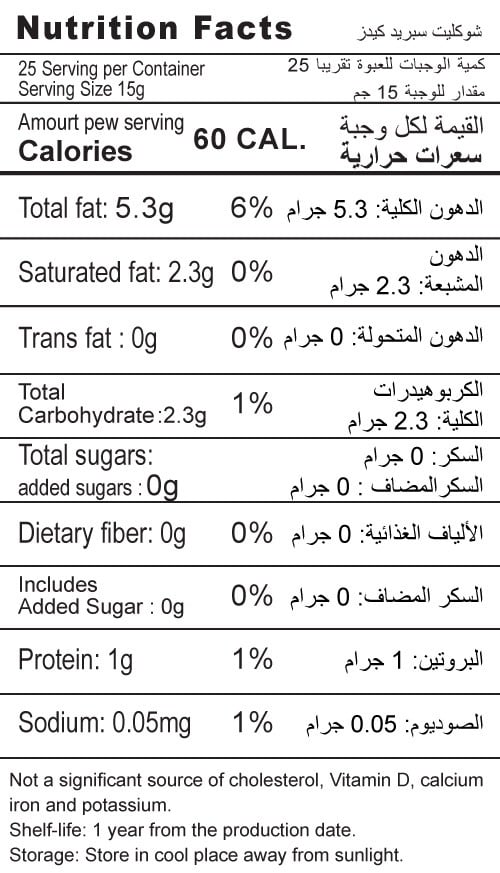 سبريد مصنوع خصيصًا للأيادي الصغيرة والشهية الكبيرة! سبريد شوكولاتة البندق للأطفال من هيلثي اند تيستي هو وجبة خفيفة لذيذة ومغذية سيحبها طفلك—وستحبين أنتِ مكوناته الصحية. محلى طبيعيًا بستيفيا وخالي 100% من السكر، غني بالنكهة وخالٍ من زيت النخيل، المواد الحافظة، والزيوت المهدرجة. مثالي للساندويتشات في اللانش بوكس، على البان كيك، أو كسناك سريع أثناء اليوم، يساعد على تكوين عادات غذائية صحية للأطفال مع طعم يعشقونه.